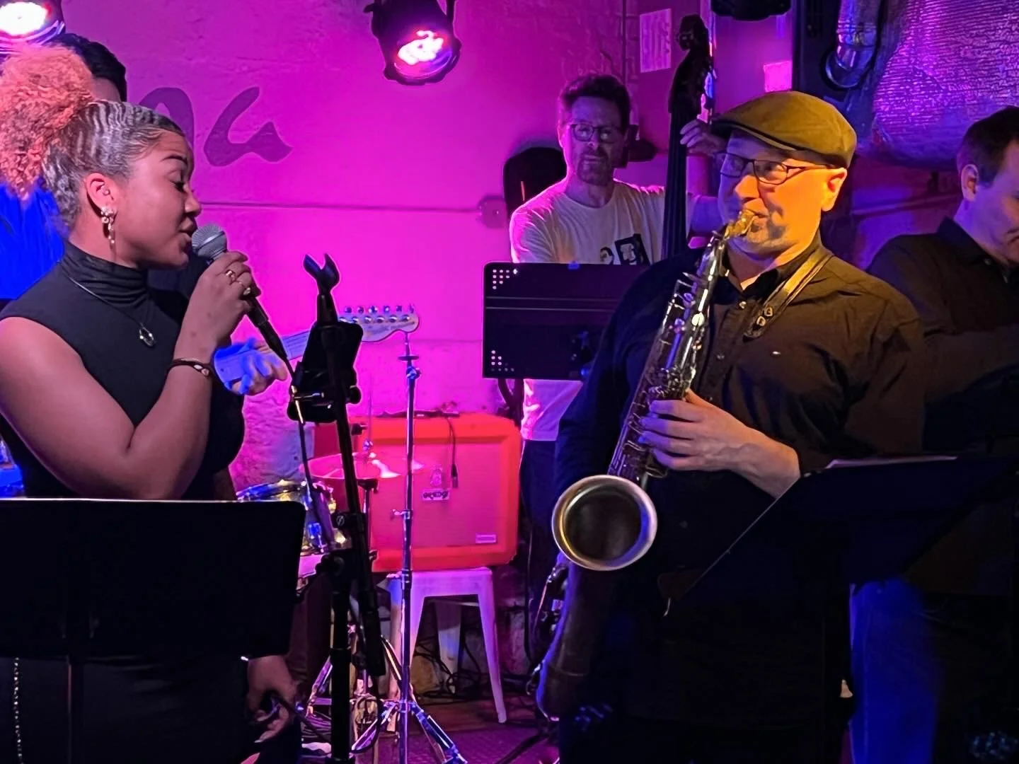 The band features active NYC-based musicians, including vocals, guitar, piano, bass drums, and a horn section consisting of saxophone, trumpet, and trombone.
